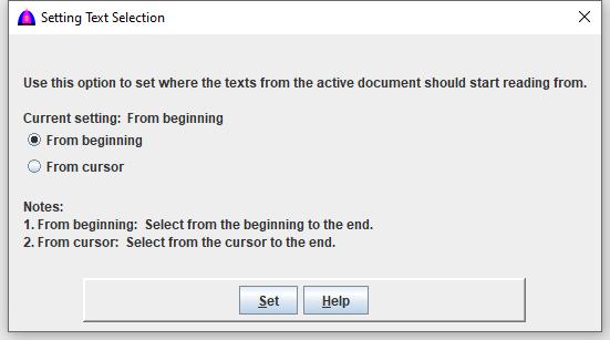 Use this option to set where the texts from the active document should start reading from when clicking the read button, but there is no selection.