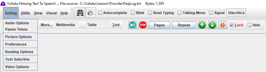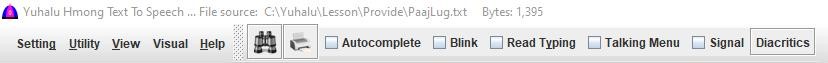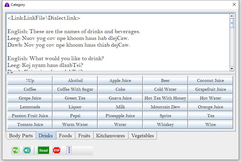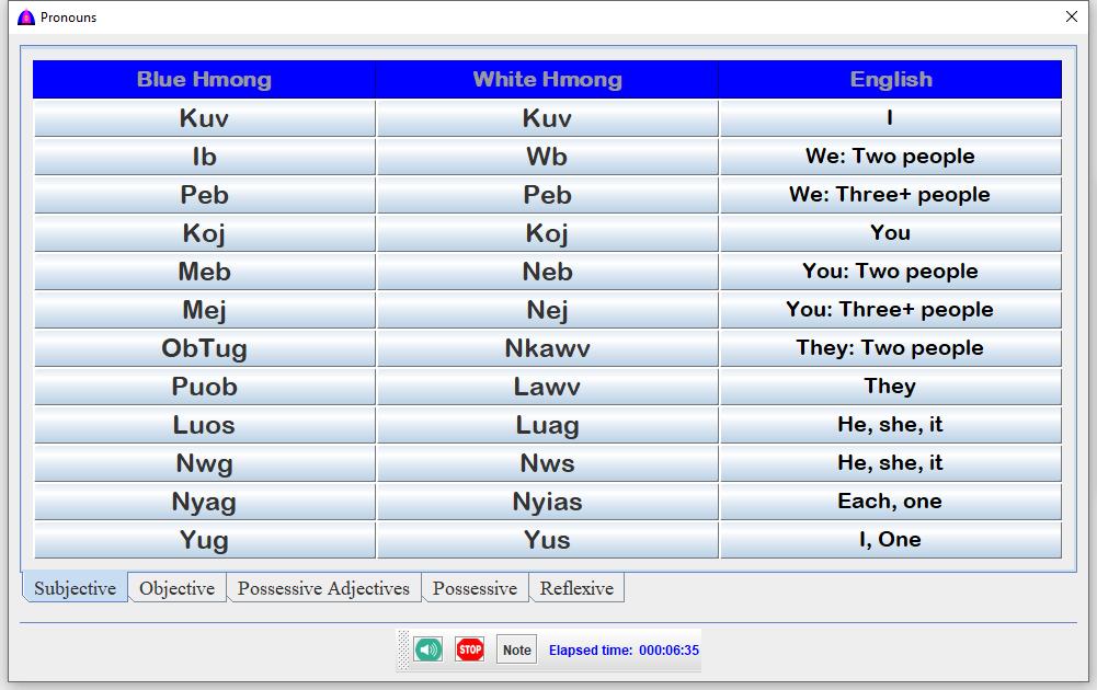 | Dawb | Check to read texts on clicked button in White Hmong dialect. |