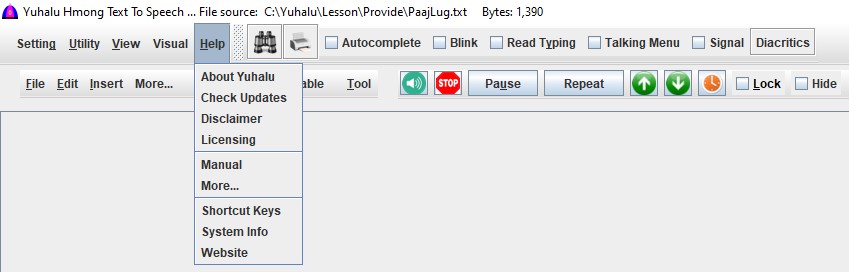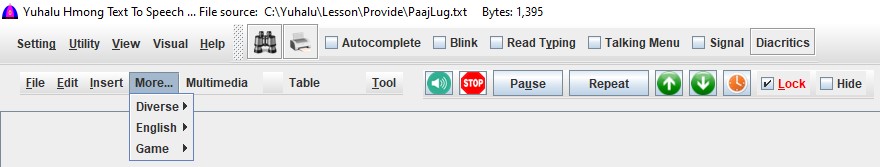 This software supports both White Hmong (Hmoob Dawb) and Blue Hmong (Hmoob Leeg) dialects, written in the Romanized Popular Alphabet (RPA) used in Southeast Asia. It can also read English text.