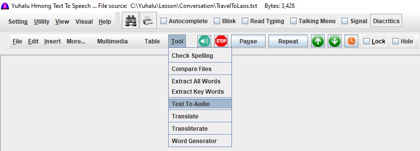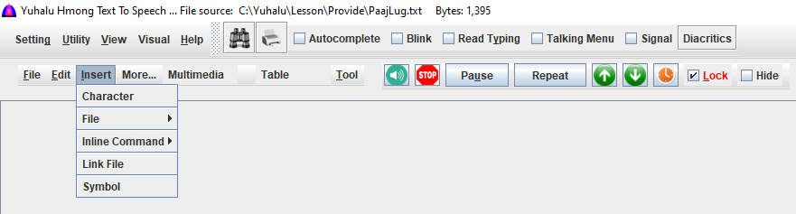 Audio Insert one or multiple audios selected from popup window to the cursor location to play audio. For more detail, Refer to its screen or help file InsertAudio.html. The inserted text has the complete absolute path, example: C:\Yuhalu\Audio\Music\MyFavoriteSong.mp3. Relative path such as Audio\Music\MyFavoriteSong.mp3 will work fine too if it is a local file. Audio formats: WAV, MP3, FLAC – speech, music, sound effects, etc. IMPORTANT: Make sure that no file name contains spaces. The software parses words using space as boundary. Remove spaces from file names first. |