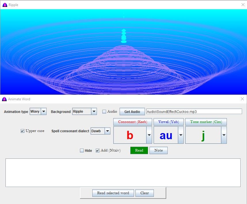 There are two windows for this option. The top window is for animation.The bottom window is for the user to interact with by entering RPA consonant, vowel and tone marker, and along with other parameters for sound and animations.