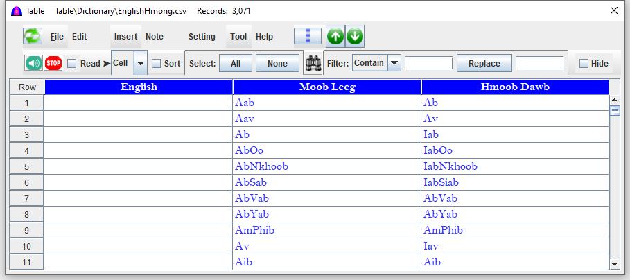 Using modern OCR technology (such as Acrobat and others), printed Hmong dictionaries, Bibles, and publications can be scanned. This feature allows extraction of monosyllables, disyllables, and polysyllables from those documents. -