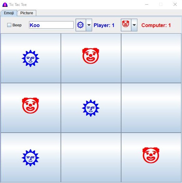To change emoji for either the player or the computer, click the arrow on the combobox on the emoji tab.