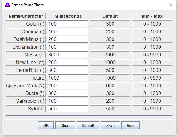 | Clear all values to blank meaning zero (0). Note: When everything is blank, it means that there is no punctuation pause at all. In analogy, it is the same as reading some writings without a single punctuation mark. | |