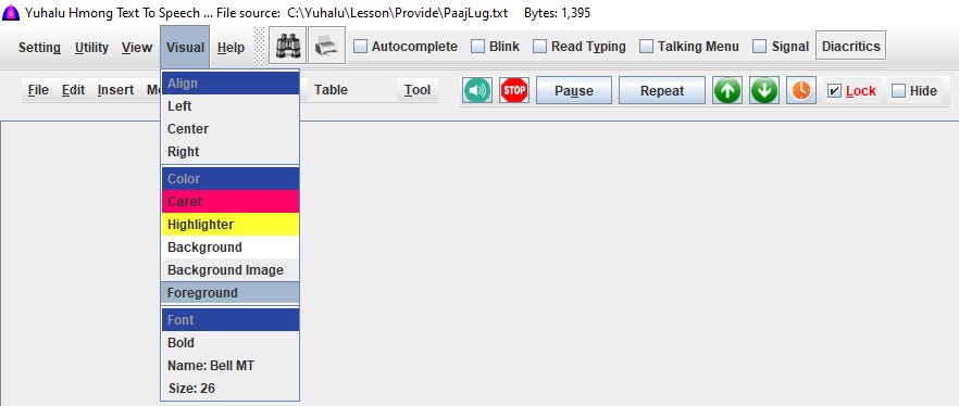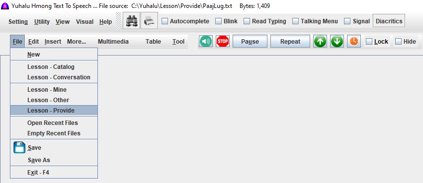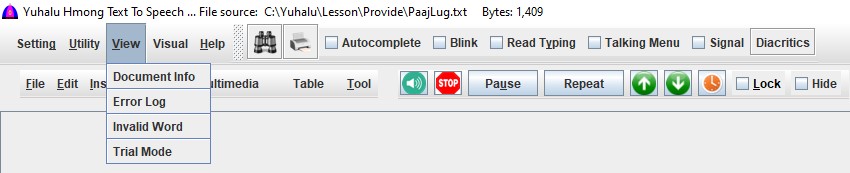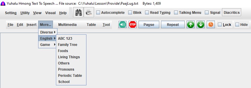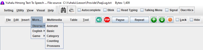 This software supports both White Hmong (Hmoob Dawb) and Blue Hmong (Hmoob Leeg) dialects, written in the Romanized Popular Alphabet (RPA) used in Southeast Asia. It can also read English text.