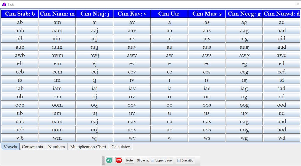 - Several lessons are included to help users learn vowels, consonants, tones, and other components of the Hmong language. Lessons may include text, audio, video, buttons on multiple tabs, or spreadsheet-style tables.
