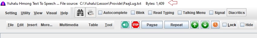 This is the top label showing the title Yuhalu Hmong Text To Speech followed by the name of the active document for the main document.Refer to its picture shown here.